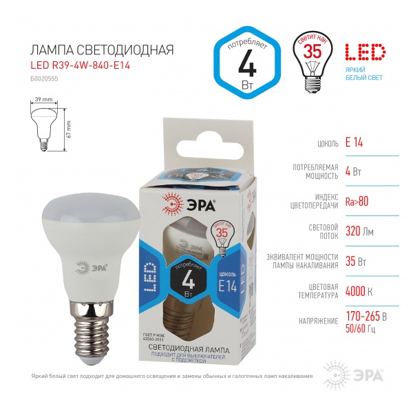 Лампа светодиодная R39-4w-840-E14 320лм ЭРА Б0017226/Б0020555