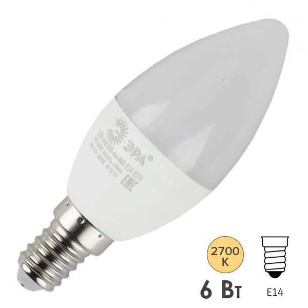 Б0020618 Лампа светодиодная свеча RED LINE ECO B35 6W/827 2700K 220V E14 теплый свет ЭРА фото 1