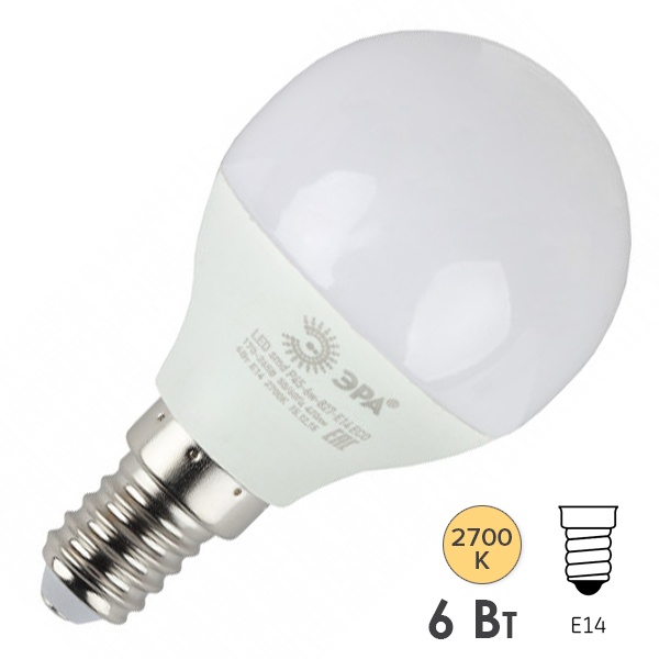 Светодиодная лампочка шарик ЭРА, мощностью 6 Ватт, с цоколем E14 (миньон), теплый свет Б0020626.