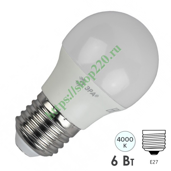 Светодиодная лампочка шарик ЭРА мощностью 6 Ватт, с цоколем E27, нейтральный белый свет, матовая колба Б0020630