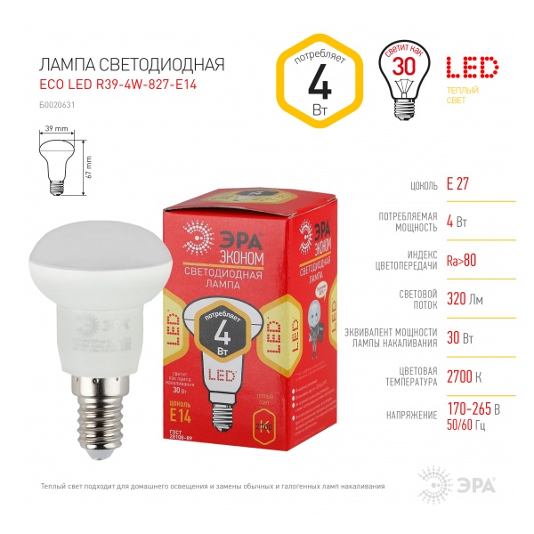 ECO LED R39-4W-827-E14 ЭРА (диод, рефлектор, 4Вт, тепл, E14) (10/100/4900)
