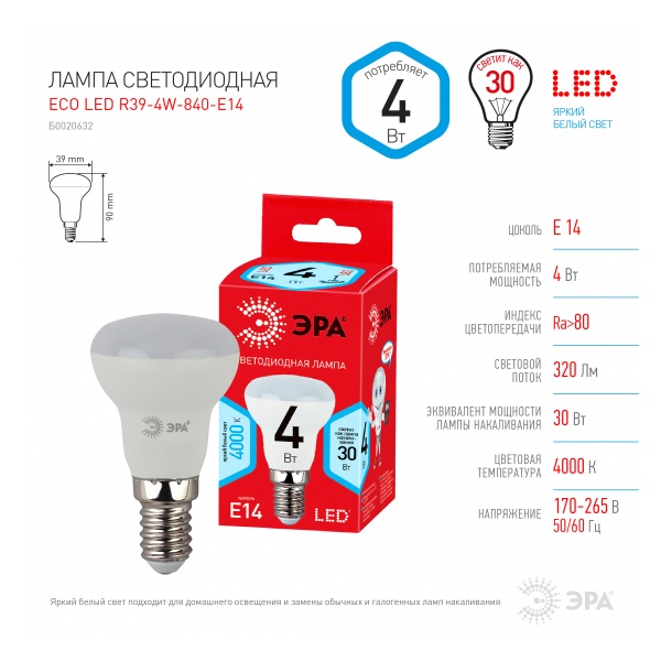 ECO LED R39-4W-840-E14 ЭРА (диод, рефлектор, 4Вт, нейтр, E14) (10/100/4900)