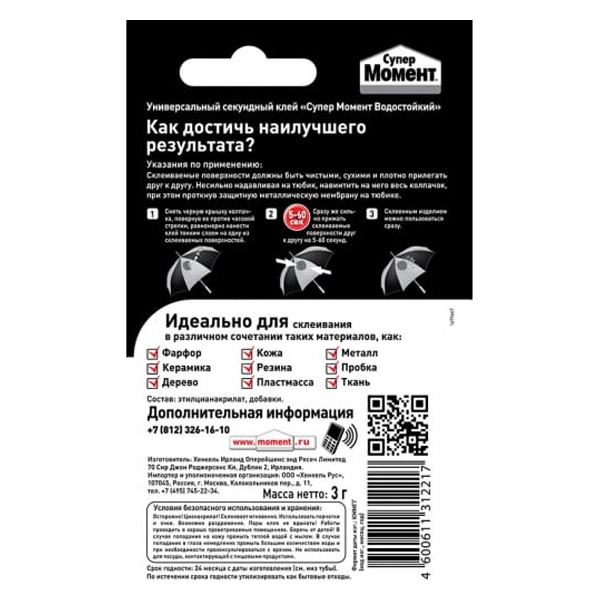 Супер Момент Водостойкий отлично склеивает широкий спектр материалов. Это надежный и стойкий прозрачный секундный клей, особо устойчивый к воздействию воды и растворителей. Выдерживает прямое воздействие воды в течение 3-24 часов.