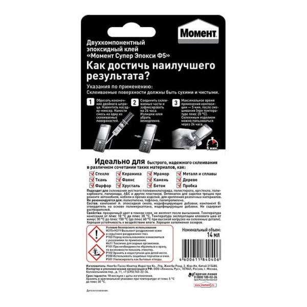 Клей не расширяется и не сжимается при отверждении, устойчив к воздействию воды, масел и растворителей. Состав может быть использован как для внутренних, так и для внешних работ. После отверждения Момент Супер Эпокси Формула 5 можно окрашивать, полировать и даже сверлить! Клей твердеет уже через 5 минут после смешивания компонентов. А через 8 часов набирает достаточно высокую прочность склеивания.