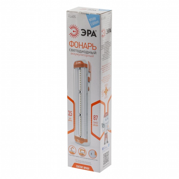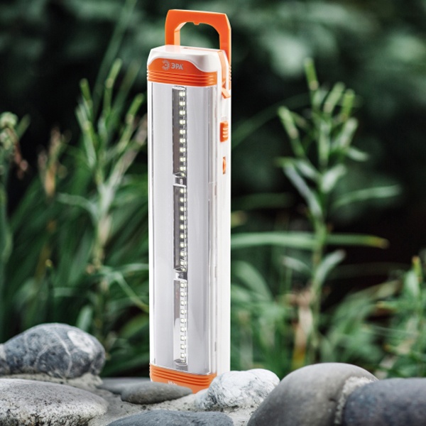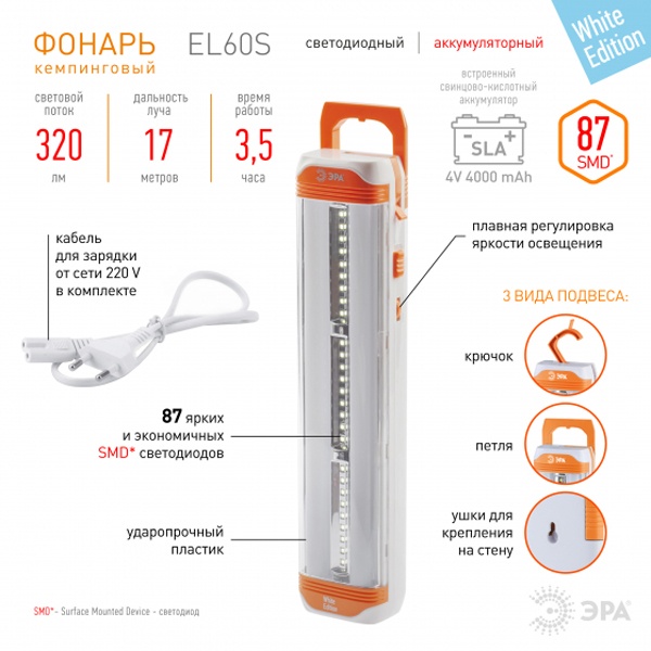 Туристический аккумуляторный фонарь EL60S на светодиодах нового поколения (SMD). В фонаре встроены 3 пластины по 9 диодов в каждой, а по бокам 2 колбы, а в каждой колбе ещё по 30 диодов. Всего получаем 87 сверх ярких диодов, которые не перегорают и не требуют замены. Такие диоды светят ярче обычных на 50% и более качественным, белым светом по цветовой температуре приближенным к естественному. То есть 87 диодов — это очень яркий и мощный свет. Очевидно, что при полной мощности фонарь светит очень ярко и поэтому предусмотрены функции регулировки освещения, например, можно включить только светодиодные пластины. Фонарь питается от аккумулятора 4В 4Ач, который заряжается от сети в 220 В. В автономном режиме фонаря хватает на 3,5 часа непрерывной работы. Дальность луча составляет 17 метров, мощность 5В, а световой поток — 320 Лм. Также в фонаре предусмотрено три вида подвеса: крючок, петля и ушки для крепления на стену. Функциональный дизайн фонаря делает удобным его использования в экстренных ситуациях, когда необходим мощный источник света. Его можно использовать как на природе, во время рыбалки или походов, так и в быту, например, на даче или в гараже. Различные системы подвесов помогают освободить руки, а регулятор освещения настроить необходимую яркость освещения.