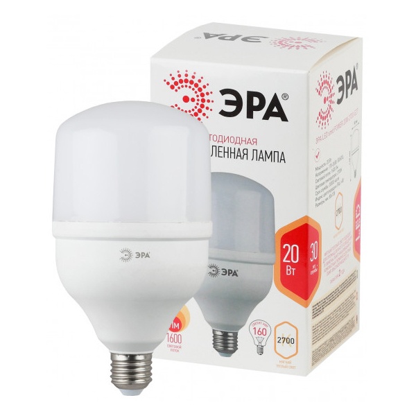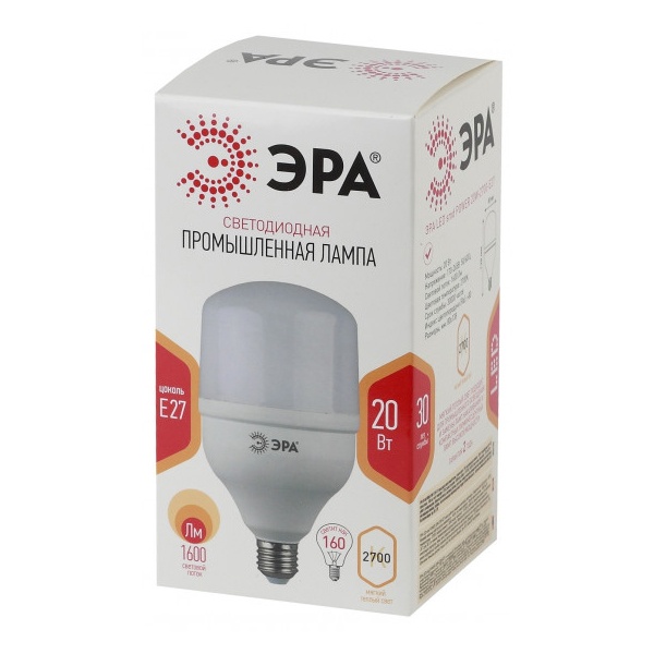 Светодиодная промышленная лампа ЭРА, мощностью 20 Ватт, с цоколем E27, теплый свет Б0027000