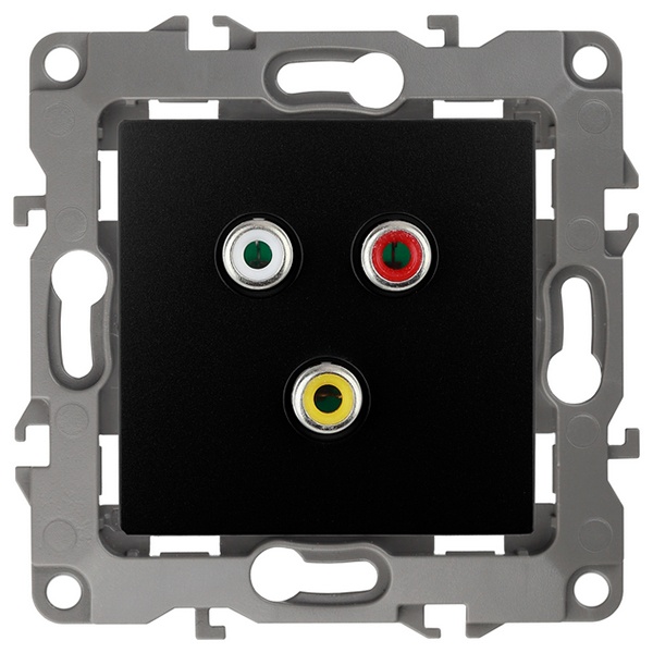 Механизм с видео-аудио разъемом RCA три гнезда с цветной маркировкой. С накладкой из негорючего пластика. Для скрытого монтажа с фиксацией в монтажную коробку на винты и распорные лапки. Для подключения используется винтовой клеммник . Суппорт с пазами для ровного объединения механизмов по горизонтали и вертикали.