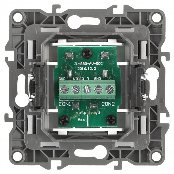 Механизм с видео-аудио разъемом RCA три гнезда с цветной маркировкой. С накладкой из негорючего пластика. Для скрытого монтажа с фиксацией в монтажную коробку на винты и распорные лапки. Для подключения используется винтовой клеммник . Суппорт с пазами для ровного объединения механизмов по горизонтали и вертикали.