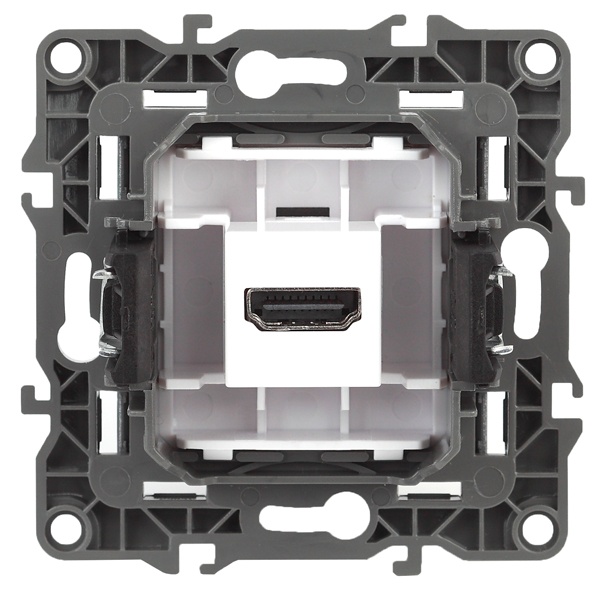 Механизм HDMI разъема. Поставляется с накладкой из негорючего пластика. Подходит для скрытого монтажа в подрозетники на винты или монтажные лапки. Суппорт с пазами для выравнивания по горизонтали и вертикали.