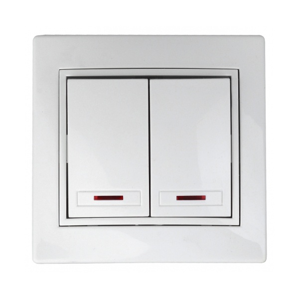 Двухклавишный выключатель белого цвета со световой индикацией для скрытой установки в сухих помещениях, Intro серии Plano. Б0027603
