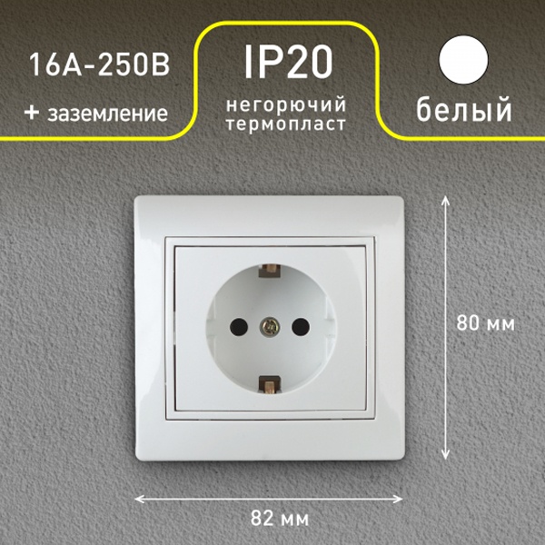 Розетка электрическая с заземляющим контактом для установки скрыто в монтажные коробки на распорные лапки, либо винты. Накладка и рамка выполнены из негорючего пластика. Механизм изготовлен из керамики стойкой к температурам.