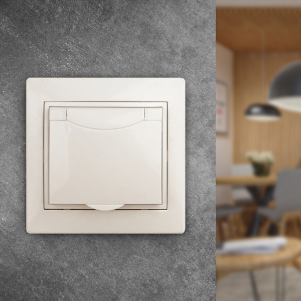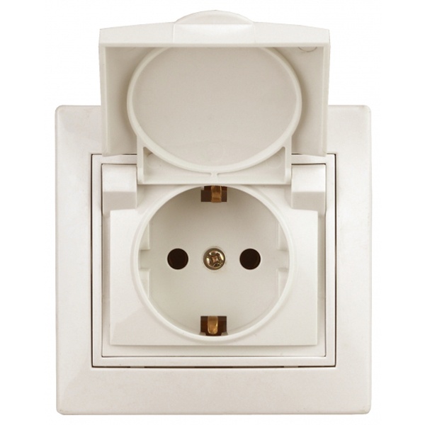 Розетка электрическая бытовая с заземляющим контактом и защитной крышкой для установки скрыто в монтажные коробки на распорные лапки, либо винты. Накладка и рамка выполнены из негорючего пластика. Механизм изготовлен из керамики стойкой к температурам.
