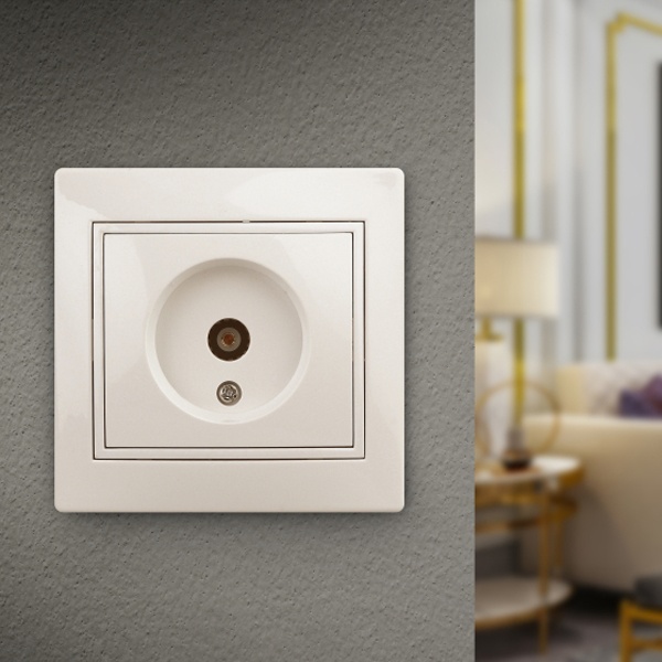 Розетка телевизионная с одним гнездом для установки скрыто в монтажные коробки на распорные лапки, либо винты. Накладка и рамка выполнены из негорючего пластика.
