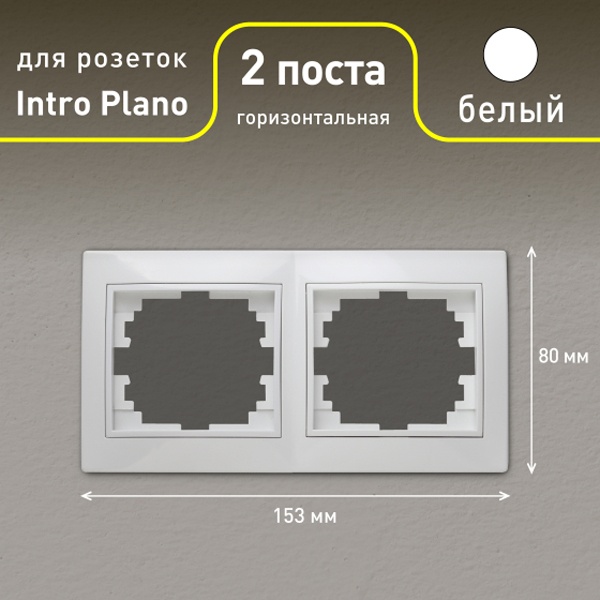 Декоративная рамка изготовлена из негорючего пластика с перегородкой на 2 электроустановочных изделия Intro серии Plano. Горизонтальной установки, белого цвета, размером 80*153*8мм.