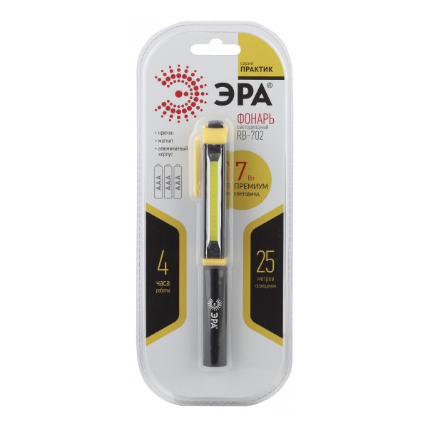 • Фонарь ЭРА Рабочий RB-702 серия Практик 7W COB, батареи 3xAAA, крючок, магнит