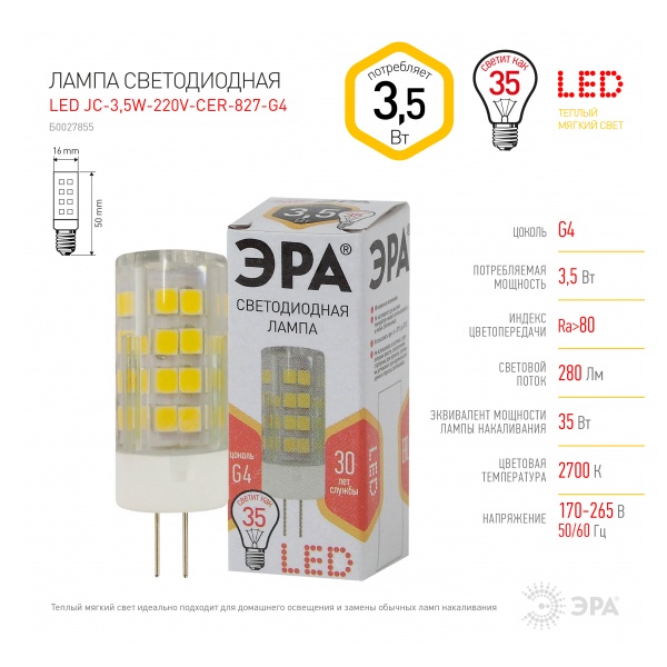 Б0027855 Лампа светодиодная ЭРА LED JC-3,5W-220V-CER-827-G4 керамика теплый свет