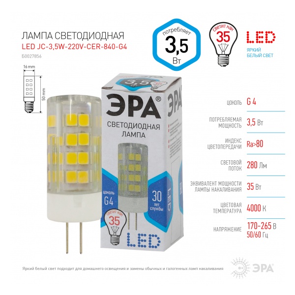 Б0027856 Лампа светодиодная ЭРА LED JC-3,5W-220V-CER-840-G4 керамика холодный свет