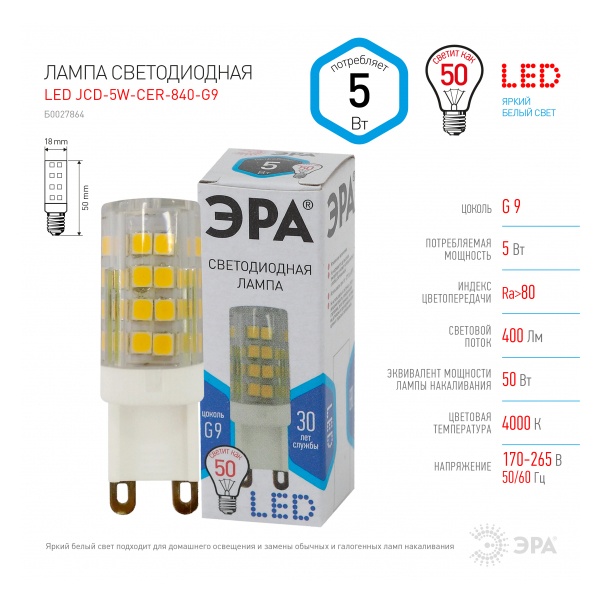 • Лампа светодиодная капсула ЭРА LED JCD-5W-CER-840-G9 4000K 220V керамика холодный свет