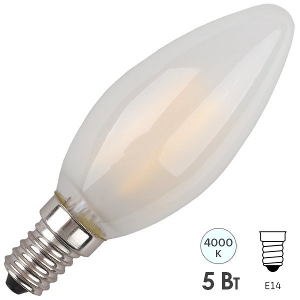 Энергосберегающая LED лампочка свеча с нитевидными светодиодами, мощностью 5 Ватт, с цоколем E14, нейтральный белый свет, матовая колба Б0027926