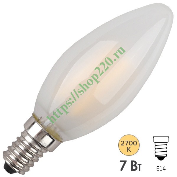 Энергосберегающая LED лампочка свеча с нитевидными светодиодами, мощностью 7 Ватт, с цоколем E14, теплый свет, матовая колба Б0027952