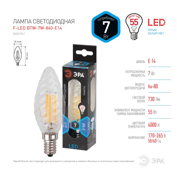 Характеристики: - Мощность: 7 Вт (эквивалент мощности 55 Вт)