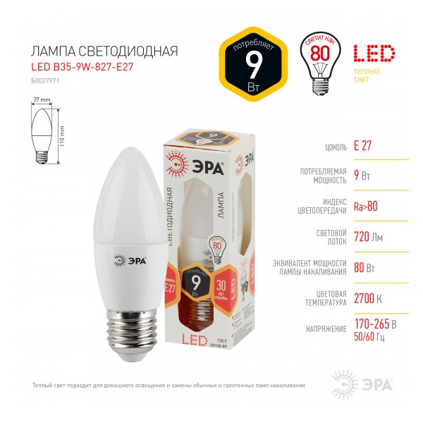 • Мощность: 9 Вт (эквивалент мощности 80 Вт)