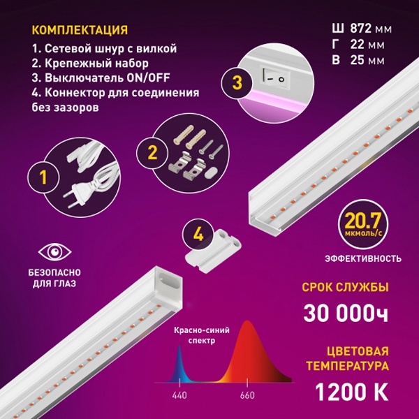 Светильник предназначен для освещения растений в условиях отсутствия или недостатка солнечного света. Особый спектр световых волн, наиболее подходящий для фотосинтеза, способствует их быстрому развитию и росту.