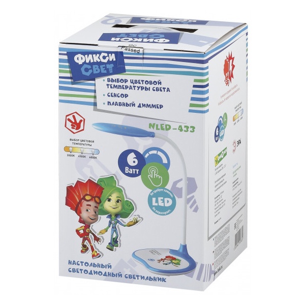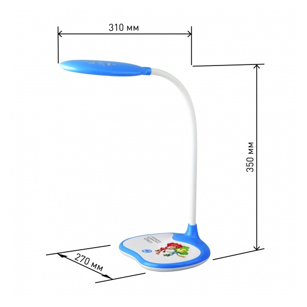 Настольный светильник ЭРА NLED-433-6W-BU серии ФИКСИКИ, созданной по мотивам популярного современного мультфильма. Светильник оснащен сенсорным управлением и возможностью выбора цветовой температуры (теплый, нейтральный или холодный свет). Яркость регулируется при помощи плавного диммера. Плафон наклоняется и поворачивается в любом направлении для максимального комфорта при использовании. Устойчивое основание. Этот современный настольный светильник оценит ребенок, интересующийся гаджетами и новыми технологиями. То есть практически каждый ребенок! Уроки будут делаться с удовольствием!