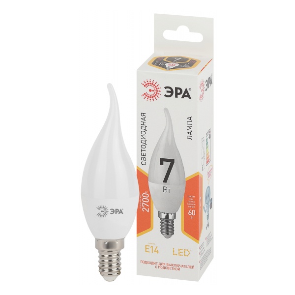 Лампа светодиодная BXS-7w-827-E14 свеча на ветру 560лм ЭРА Б0028482