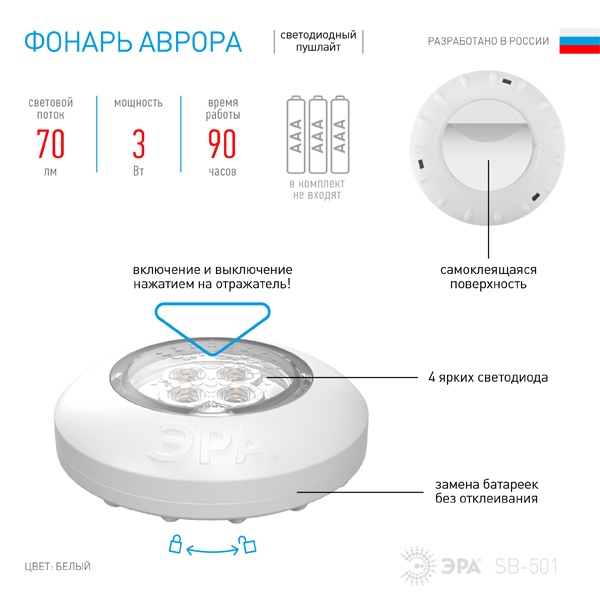 SB-501 Фонарь ЭРА пушлайт "Аврора" [4xLED, 3xAAA, белый, 1шт в кор] (60/240/1920)