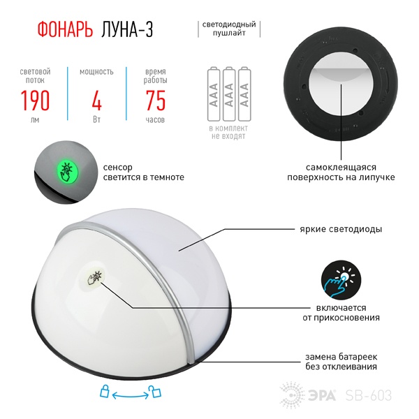 Светодиодный фонарь-пушлайт, компактный, яркий и практичный. Фонарь клеится на любую поверхность, может использоваться, как для аварийного освещения , так и в качестве декоративной подсветки. Пушлайт это слово образовано от двух английских "push" - "нажимать" и "light" - "свет". То есть достаточно простого нажатия, чтобы сенсор сработал и фонарь включился. В фонаре самое главное это качество света. На смену старым светодиодам пришли премиум-источники света формата СОВ (chip on board). Это множество LED-элементов, расположенных на общей компактной пластине. Технология, которая ранее применялась только в рамках освещения больших производственных площадок, адаптирована для создания универсального света. То есть фонарь светит ярче и работает намного дольше, чем аналоги на старых светодиодах. Для этого фонаря была разработана специальная конструкция, корпус разделн на две части, что позволяет осветить только нужную часть пространства. Фонарь питается от трех батареек ААА и может работать 75 часов без перерыва. Дальность луча составляет 5 метров. Сенсор легко найти, светонакопительный стикер мягко светится в темноте.