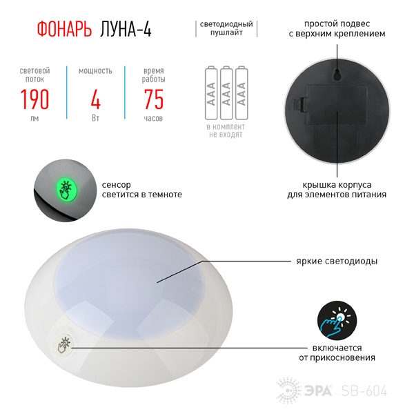 Фонарь-подсветка может использоваться как аварийное освещение, так и интерьерный свет. Фонарь компактный, выполнен в минималистичном дизайне. Он впишется и в интерьер, в качестве декоративного освещения, а не только как аварийный вариант подсветки. Пушлайт включается лгким прикосновением, сенсор включения светится в темноте, так что его легко найти. Пушлайт портативный фонарик, удобный и практичный, может быть установлен как в доме, в качестве освещения коридора, полок или кладовки, так и в палатке или в машине. Фонарь легко клеится к любой поверхности, при этом его не нужно отклеивать, чтобы заменить батарейки. В фонаре использованы светодиоды нового поколения, которые ярче и наджнее обычных.Фонарь пушлайт "Луна-4" лучший выбор для использования в быту. Это лгкий и наджный фонарик, который можно использовать в различных повседневных ситуациях. Фонарь дат мягкий ровный белый свет, не нагревается. Фонарь долго работает, поскольку светодиоды очень энерго экономичные и наджные.