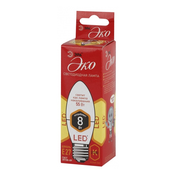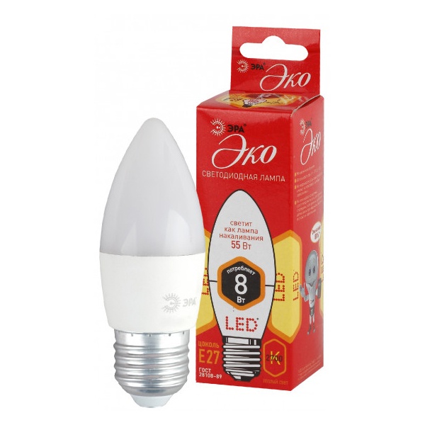 Энергосберегающая LED лампочка свеча мощностью 8 Ватт с цоколем E27 теплый свет Б0030020