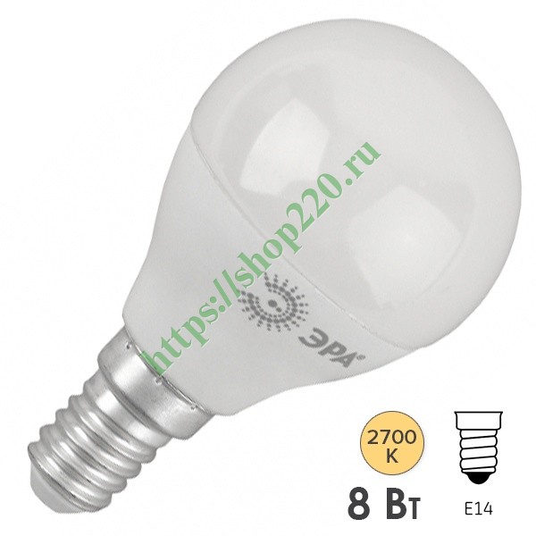 Светодиодная лампочка шарик ЭРА, мощностью 8 Ватт, с цоколем E14 (миньон), теплый свет Б0030022