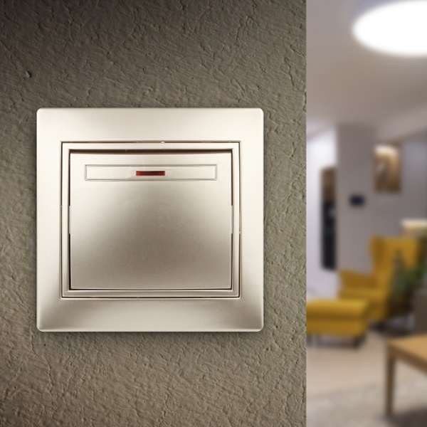 Одноклавишный выключатель цвета шампань со световой индикацией для скрытой установки в сухих помещениях, Intro серии Plano. Б0030035