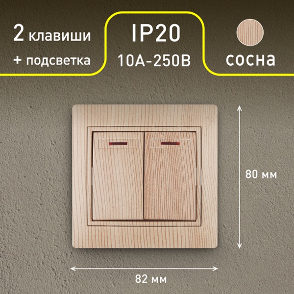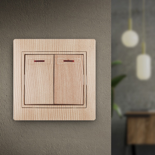 Двухклавишный выключатель цвета сосна со световой индикацией для скрытой установки в сухих помещениях, Intro серии Plano. Б0030049