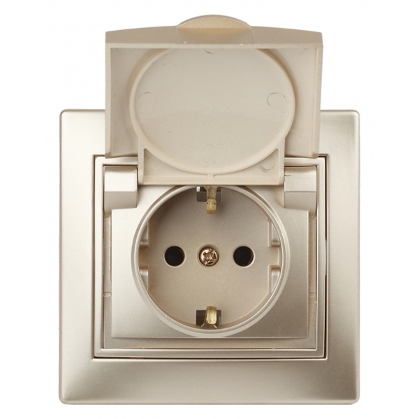 Розетка электрическая бытовая с заземляющим контактом и защитной крышкой для установки скрыто в монтажные коробки на распорные лапки, либо винты. Накладка и рамка выполнены из негорючего пластика. Механизм изготовлен из керамики стойкой к температурам.