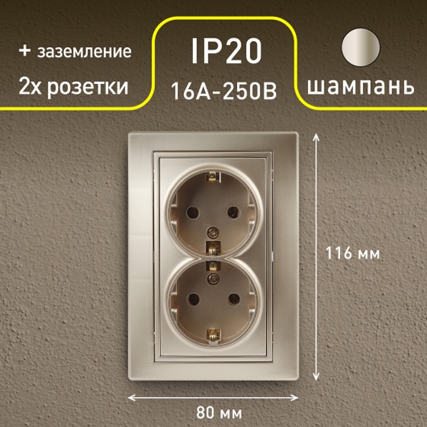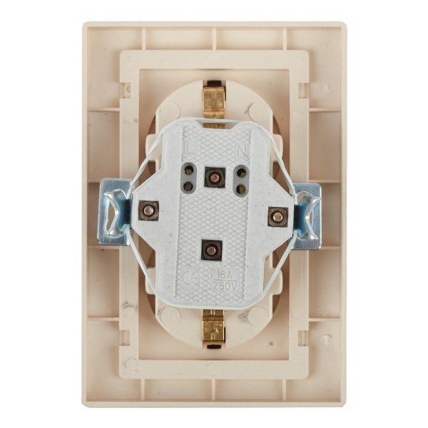 Розетка электрическая двойная с заземляющим контактом для установки скрыто в одну монтажную коробку на распорные лапки, либо винты. Накладка и рамка выполнены из негорючего пластика. Механизм изготовлен из керамики стойкой к температурам. Латунная контактная группа с винтовым подключением.