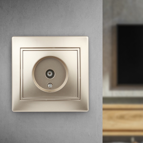 Розетка телевизионная с одним гнездом для установки скрыто в монтажные коробки на распорные лапки, либо винты. Накладка и рамка выполнены из негорючего пластика.