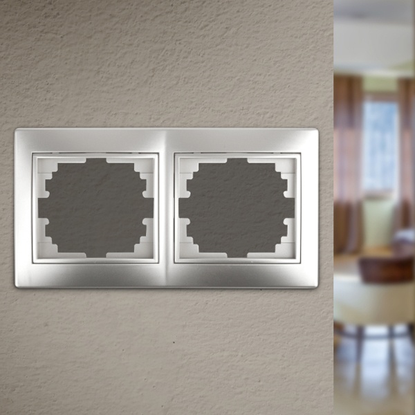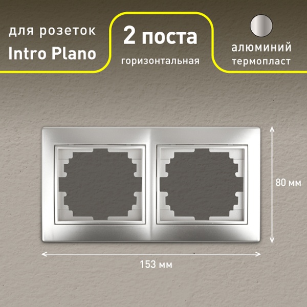 Декоративная рамка изготовлена из негорючего пластика с перегородкой на 2 электроустановочных изделия Intro серии Plano. Горизонтальной установки, цвета алюминий, размером 80*153*8мм.