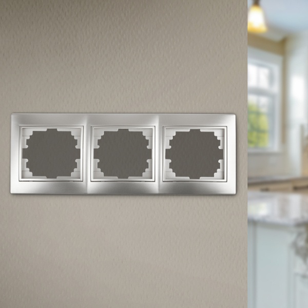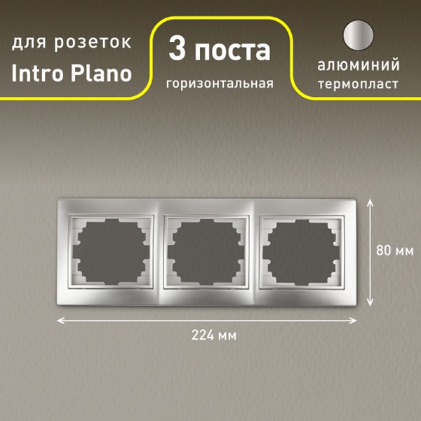 Декоративная рамка изготовлена из негорючего пластика с перегородками на 3 электроустановочных изделия Intro серии Plano. Горизонтальной установки, цвета алюминий, размером 80*224*8мм.