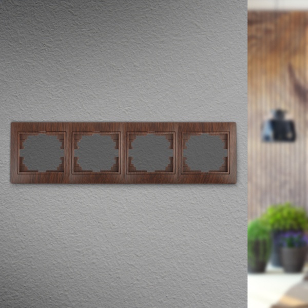 Декоративная рамка изготовлена из негорючего пластика с перегородками на 4 электроустановочных изделия Intro серии Plano. Горизонтальной установки, цвета под дерево "венге", размером 80*295*8мм.