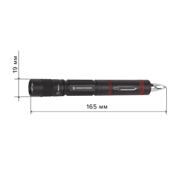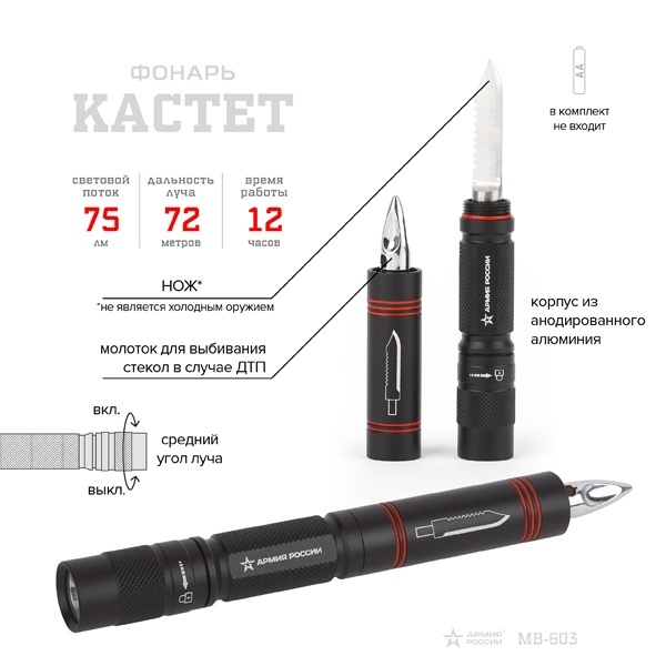 ЭРА Армия России Кастет - фонарь-нож и фонарь-молоток для стекла одновременно. Обладает световым лучом повышенной дальности - 72 метра. Работает от одной пальчиковой батарейки в течение 72 активных часов. Сверхъяркий и суперэкономичный LED-источник света не требует обслуживания и замены на протяжении всего срока службы фонаря. ЭРА Армия России Кастет выпускается в прочном металлическом корпусе с рифлёными противоскользящими вставками. Длина ножа - 4,5 см. Двустороннее лезвие - острое и серрейторное (рифлёное). Этот фонарь - настоящий трансформер: благодаря съёмным откручивающимся ручкам, можно получить отдельно фонарь, нож и молоток для стекла.