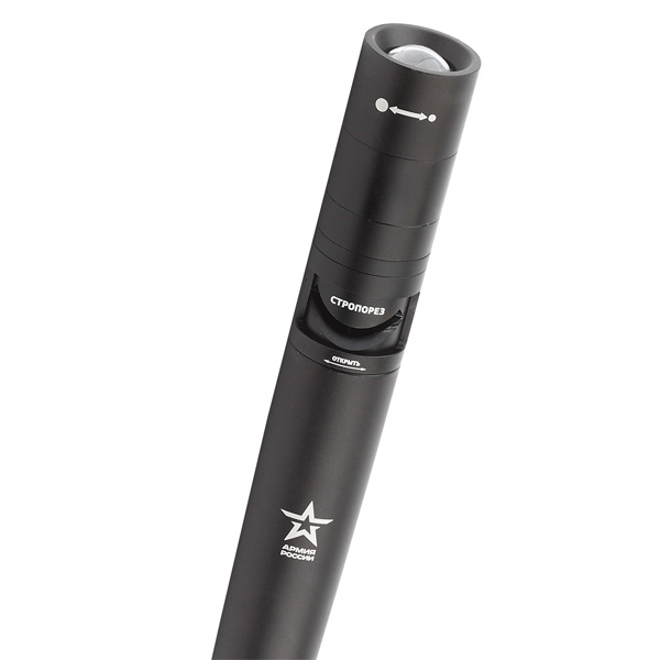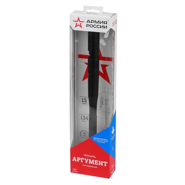 ЭРА Армия России Аргумент - мощный фонарь-автоспасатель со стропорезом и молотком для стекла. Один из самых необычных фонарей на современном рынке. Представитель уникальной совместной серии бренда ЭРА и АО "Военторг" (действующего на основе лицензии Министерства обороны РФ), этот яркий качественный фонарь снабжён стропорезом и молотком для стекла. Такой функционал позволяет использовать его как автоспасатель. Актуальный практичный гаджет, который должен быть в автомобиле каждого мужчины. Особая конструкция и прочность корпуса позволяют применять ЭРА Армия России Аргумент для самозащиты. Фонарь упакован в картонную подарочную коробку в узнаваемой стилистике бренда "Армия России". Фирменная звезда "Армия России" - и на корпусе самого фонаря. Высокое качество освещения: сверхдальность (134 метра), оптимальный световой поток (200 лм), регулируемый фокус (дальний направленный, средний и ближний заливающий свет). Фонарь ЭРА Армия России Аргумент работает от 4 пальчиковых батареек - это 15 часов качественного света. Благодаря эргономичной конструкции, его удобно и приятно держать в руках.