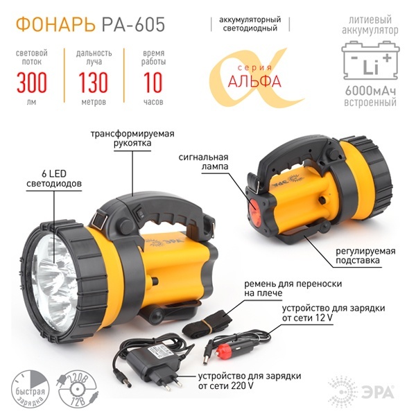 Аккумуляторный светодиодный прожектор. 6 LED диодов. Аккумулятор литий 6000 мА. Адаптер от электрической сети AC 220 V, от бортовой сети автомобиля DC 12V. Аксессуары: ремень для переноски на плече.