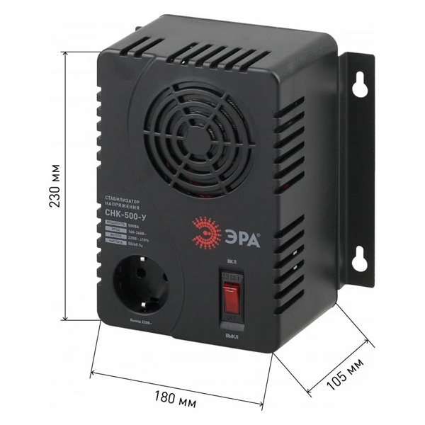 Стабилизатор напряжения ЭРА серии СНК предназначен для поддержания стабильного однофазного напряжения питания нагрузок бытового назначения в пределах 220В±10%, при отклонениях сетевого напряжения по значению и длительности в пределах от 160 до 260В.
