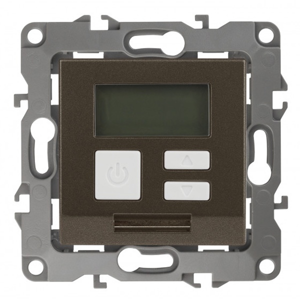 Терморегулятор теплый пол / отопление электронный серии Эра 12 СУ механизм цвет бронза 12-4111-13. Номинальные характеристики 16А 230В. Сделана из поликарбоната. Монтаж в подрозетник производится и на лапки, и на винты. Рамки приобретаются отдельно. Рамки Эра 12: 1 пост 12-5001-хх, 2 поста 12-5002-хх, 3 поста 12-5003-хх, 4 поста 12-5004-хх, 5 постов 12-5005-хх. Рамки Эра 12 Сатин: 1 пост 12-5101-хх, 2 поста 12-5102-хх, 3 поста 12-5103-хх, 4 поста 12-5104-хх, 5 постов - 12-5105-хх (хх - код цвета: 01-белый, 02-слоновая кость, 03-алюминий, 04-шампань, 05-антрацит, 06-чёрный, 07-ольха(белёный дуб-сатин), 08-вишня, 09-дуб, 10-венге, 11-сосна, 21-жёлтый, 22-оранжевый, 23-красный, 24-охра, 25-бордо, 26-лайм, 27-зелёный, 28-голубой, 29-синий).