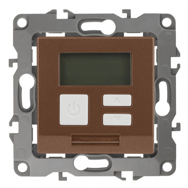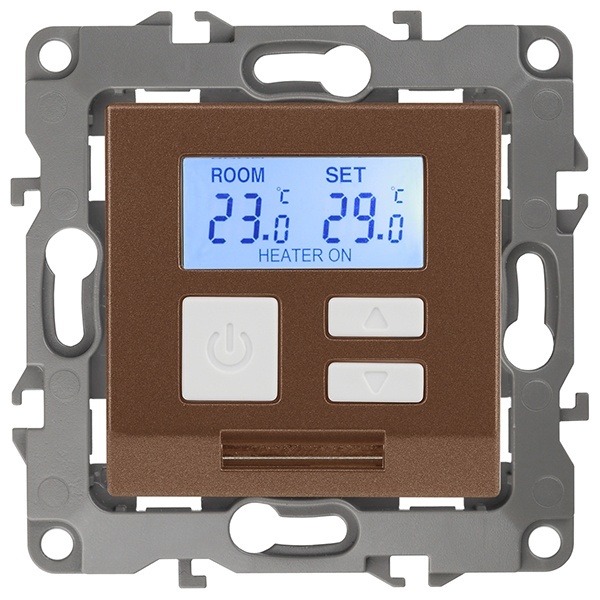 Терморегулятор электронный с датчиком воздуха и выносным датчиком температуры пола. Поставляется с накладкой из негорючего пластика. Подходит для скрытого монтажа в подрозетники на винты или монтажные лапки. Суппорт с пазами для выравнивания по горизонтали и вертикали.