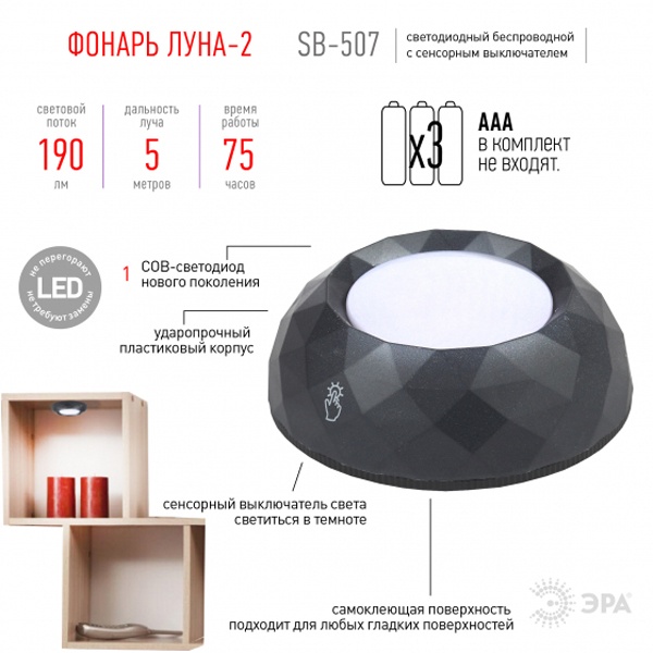 Светодиодный фонарь-пушлайт, компактный, яркий и практичный. Фонарь клеится на любую поверхность, может использоваться, как для аварийного освещения , так и в качестве декоративной подсветки. Пушлайт это слово образовано от двух английских "push" - "нажимать" и "light" - "свет". То есть достаточно простого нажатия, чтобы сенсор сработал и фонарь включился. В фонаре самое главное это качество света. На смену старым светодиодам пришли премиум-источники света формата СОВ (chip on board). Это множество LED-элементов, расположенных на общей компактной пластине. Технология, которая ранее применялась только в рамках освещения больших производственных площадок, адаптирована для создания универсального света. То есть фонарь светит ярче и работает намного дольше, чем аналоги на старых светодиодах. Для этого фонаря была разработана специальная конструкция, корпус разделн на две части, что позволяет осветить только нужную часть пространства. Фонарь питается от трех батареек ААА и может работать 75 часов без перерыва. Дальность луча составляет 5 метров. Сенсор легко найти, светонакопительный стикер мягко светится в темноте.