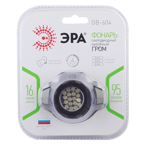Туристический налобный фонарь GB-604, лёгкий, надёжный и очень яркий. Фонарь оборудован 18 белыми светодиодами, мощность составляет 2 В, а дальность луча — 95 метров. Светодиоды дают качественный белый и яркий свет, а также не перегорают и не нуждаются в замене. Адаптивный угол наклона и 4 режима работы делают использование этого фонаря удобным. Питается от трёх батареек типа ААА, и на полной мощности работает 16 часов, не требуя замены элементов питания. Это значит, что в мигающем или менее мощном режиме фонарь прослужит намного дольше. Конструкция фонаря очень надёжная, а корпус выполнен из ударопрочного пластика с покрытием "Шагрень". Это покрытие защищает фонарь от царапин и лёгких механических повреждений, а также обладает противоскользящим эффектом. Такой фонарь является очень удобным инструментом, ведь руки остаются свободными, а направление и мощность необходимого света легко регулируется. Лаконичный дизайн модели разработан в дизайн-центре ЭРА и был удостоен награды. К главным достоинствам фонаря можно отнести качество света, лёгкость, прочность корпуса, стильный внешний вид и функциональность. Фонарь станет надёжным инструментом, как на природе, так и в гараже или на даче. Ведь свободные руки часто требуются не только в ночное время на природе, но и, например, для починки автомобиля или бытовых работ на даче. Фонарь легко и удобно крепится за счёт эластичных ремешков и не причиняет неудобств.